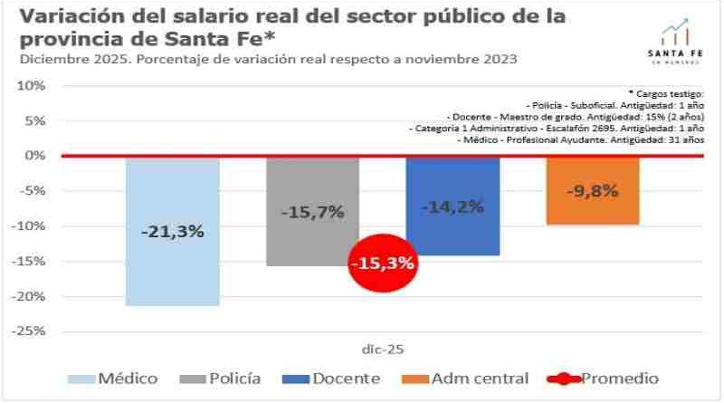 El cierre del año 2025 dejó un panorama complejo para los trabajadores de la administración pública provincial. Según los últimos relevamientos, el salario real de los agentes santafesinos continúa en terreno negativo, manteniéndose en niveles significativamente inferiores a los registrados en noviembre de 2023.