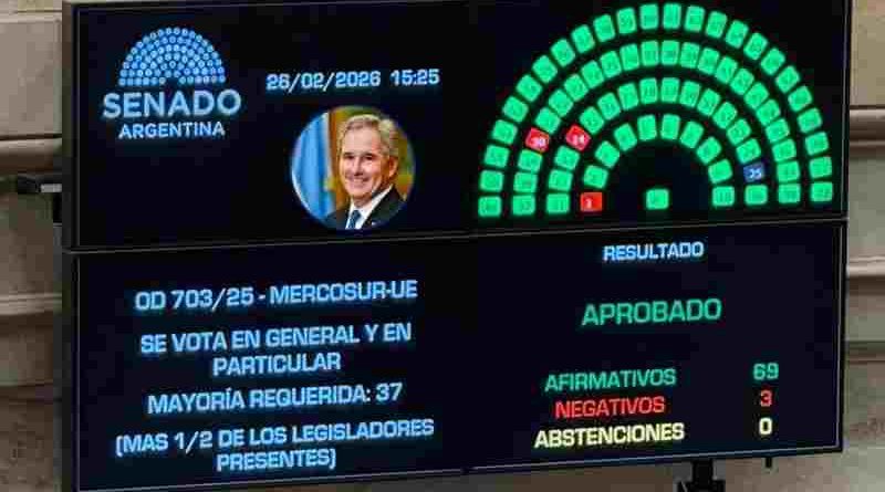 “La Unión Europea y el Mercosur consolidan una de las mayores áreas económicas del mundo: más de 700 millones de personas y un PBI de 22 billones de dólares”, afirmó y sumó que “con esta ratificación, la Comisión Europea (@eu_commission @vonderleyen) contará con las condiciones necesarias para avanzar en su aplicación provisional”, lo cual “permitirá que nuestras exportaciones comiencen a gozar de las preferencias arancelarias negociadas”, amplió.__IP__
